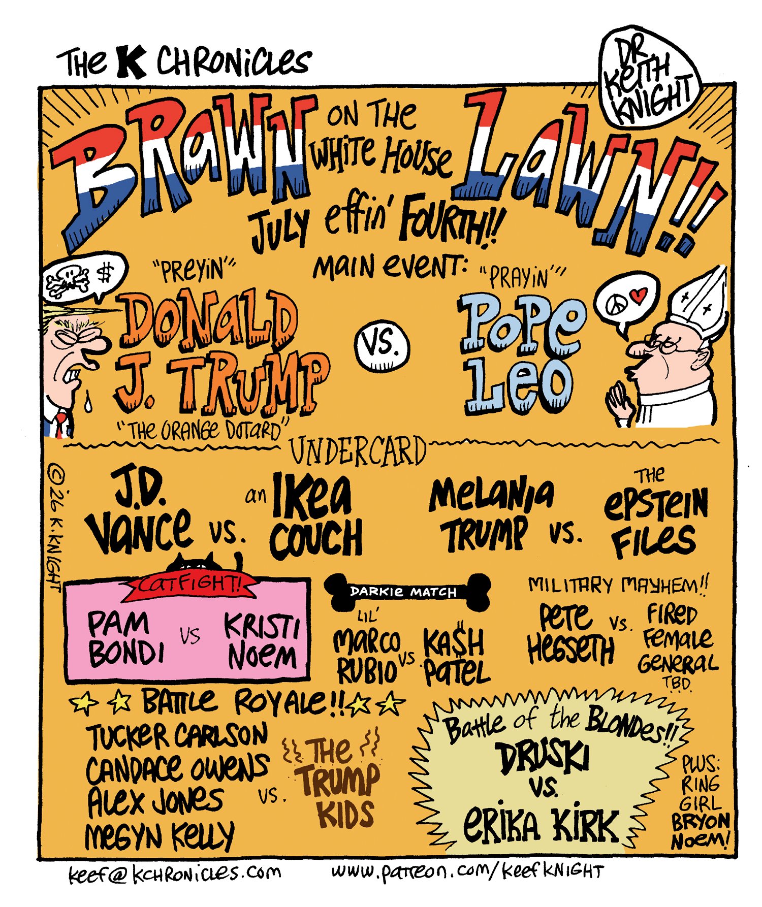 Absolutely real fight card for the upcoming Brawn on the Lawn Battle that will happen as soon as Mexico pays for the wall. A great conversation piece for family at Thanksgiving. Signed my the artist!
